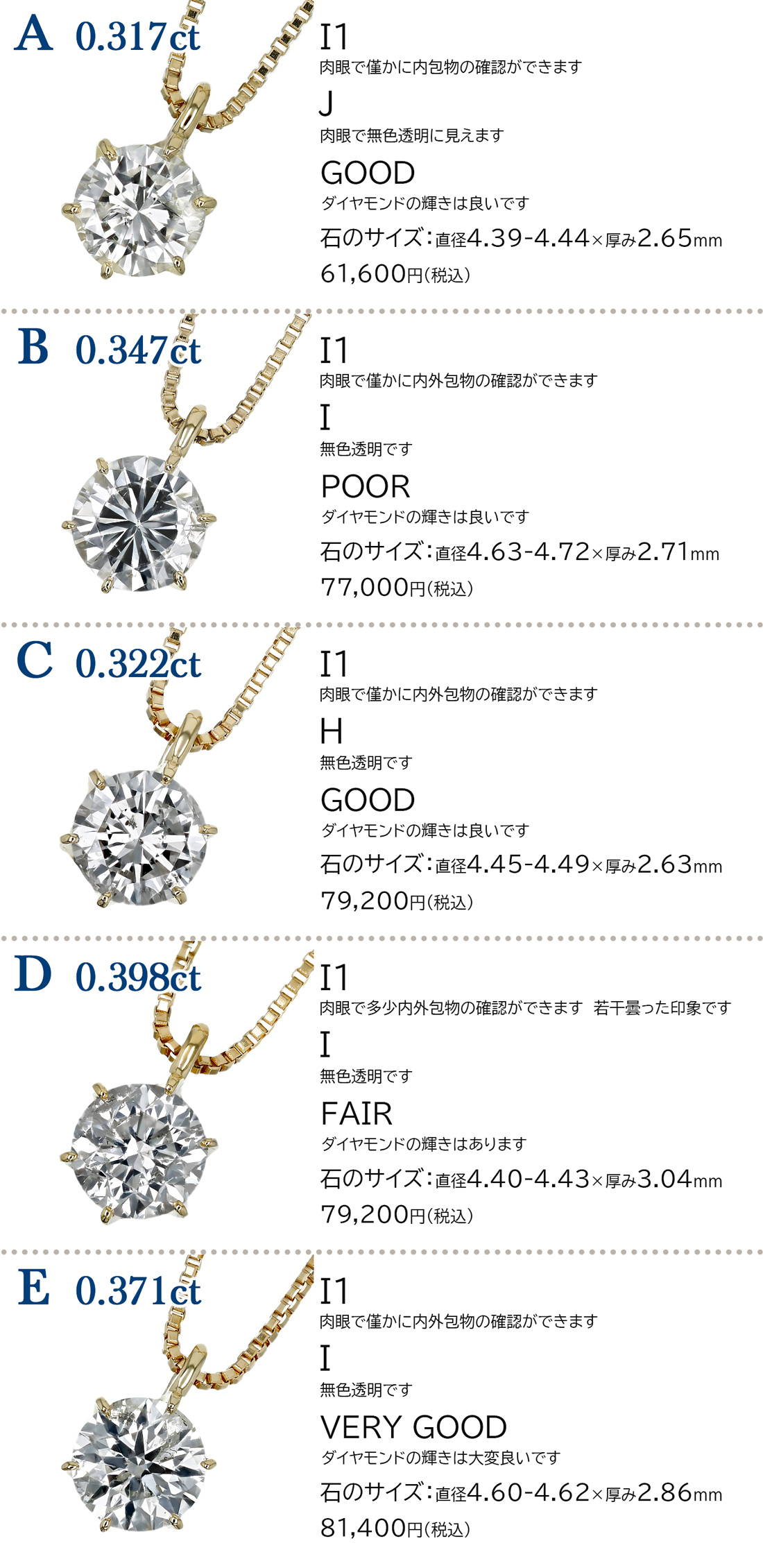 各ダイヤモンドネックレスのカラー、カットが異なりますので詳細をご確認くださいませ。