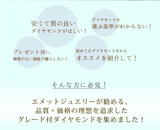 孫の成人祝いにと探していましたが、店頭で探すと、十万円程度の予算では気に入ったものがなく、困っていました。ネットで検索してエメットジェリーのウェブページでよいものを見つけ注文したものの、実物を見ないで買うのに不安がありました。 品物が届いて、孫に渡し、包装を開いたところ、輝きのよいダイヤでした。孫が大変喜んでくれました。妻はこの数倍の値段で買ったものと同じだと、孫と一緒に喜んでいました。ありがとうございました。