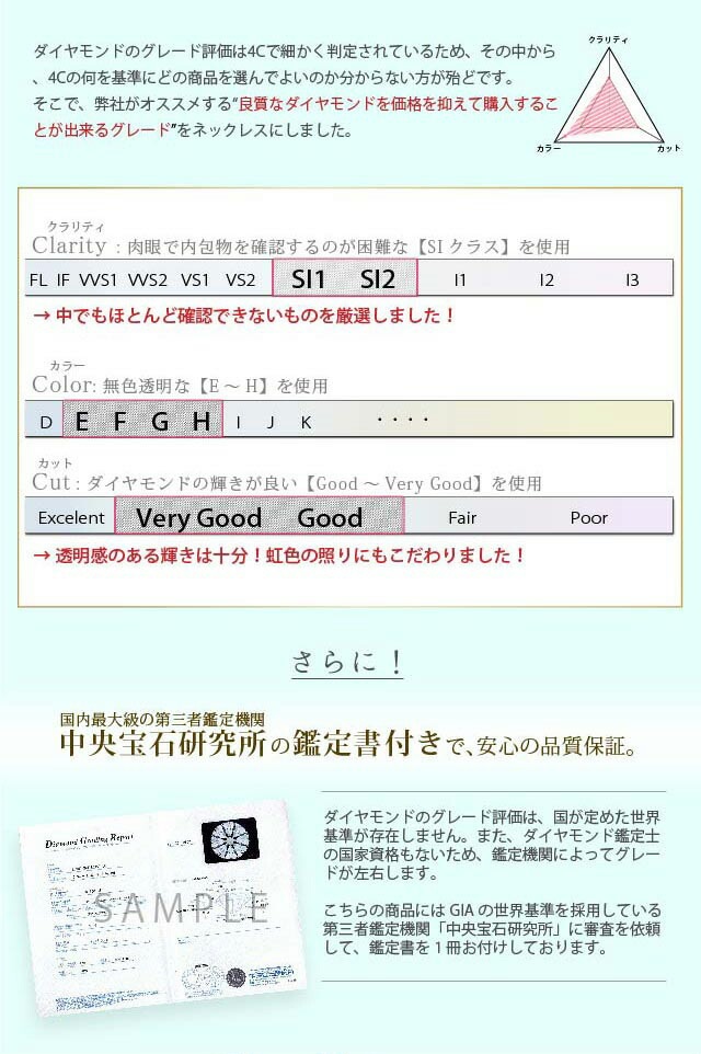 最安値に挑戦するという意気込みと共に、自信を持ってお届けできる下限ぎりぎりの、最安値に相応しいダイヤモンドネックレスと考えています。
