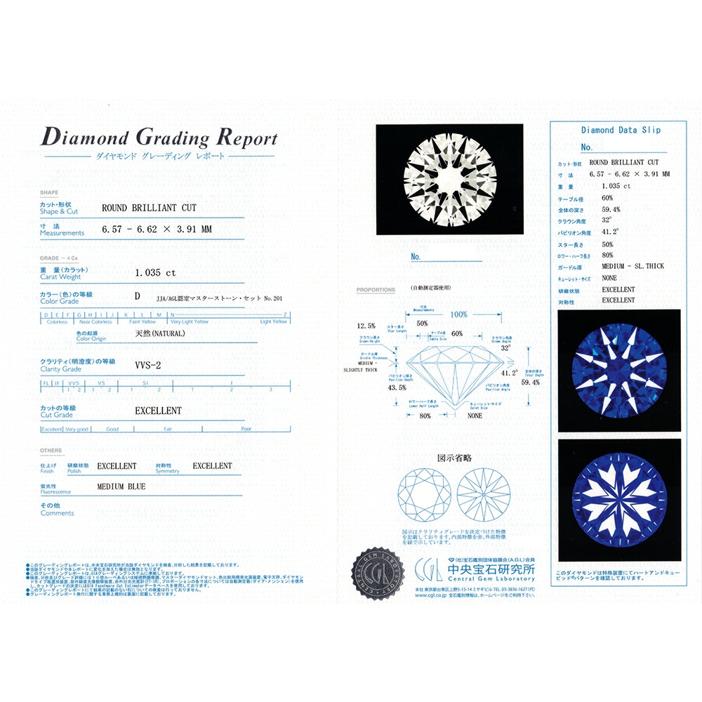 ダイヤモンドのカラットは1.035カラット、ダイヤモンド直径は6.57mm-6.62mmです。