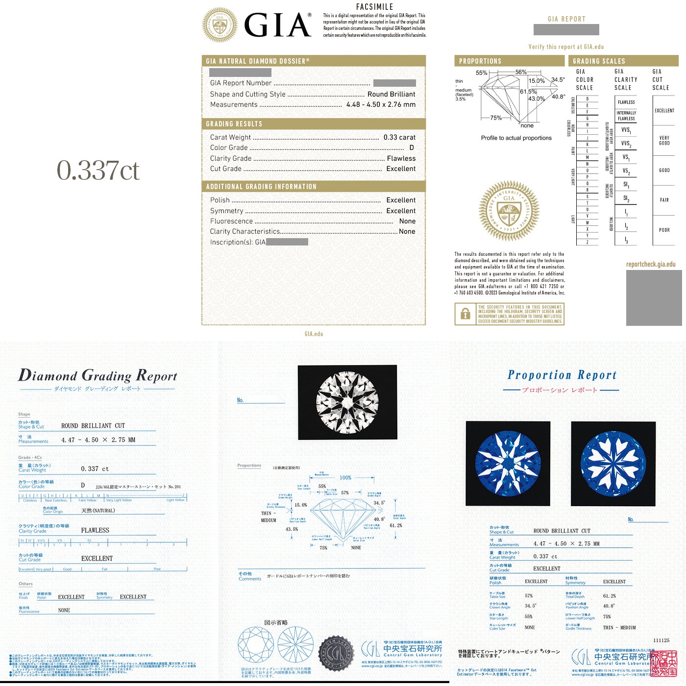 0.337カラット 寸法4.47mm-4.50mm×2.75mm(蛍光性NONE)中央宝石研究所・GIA鑑定書付き