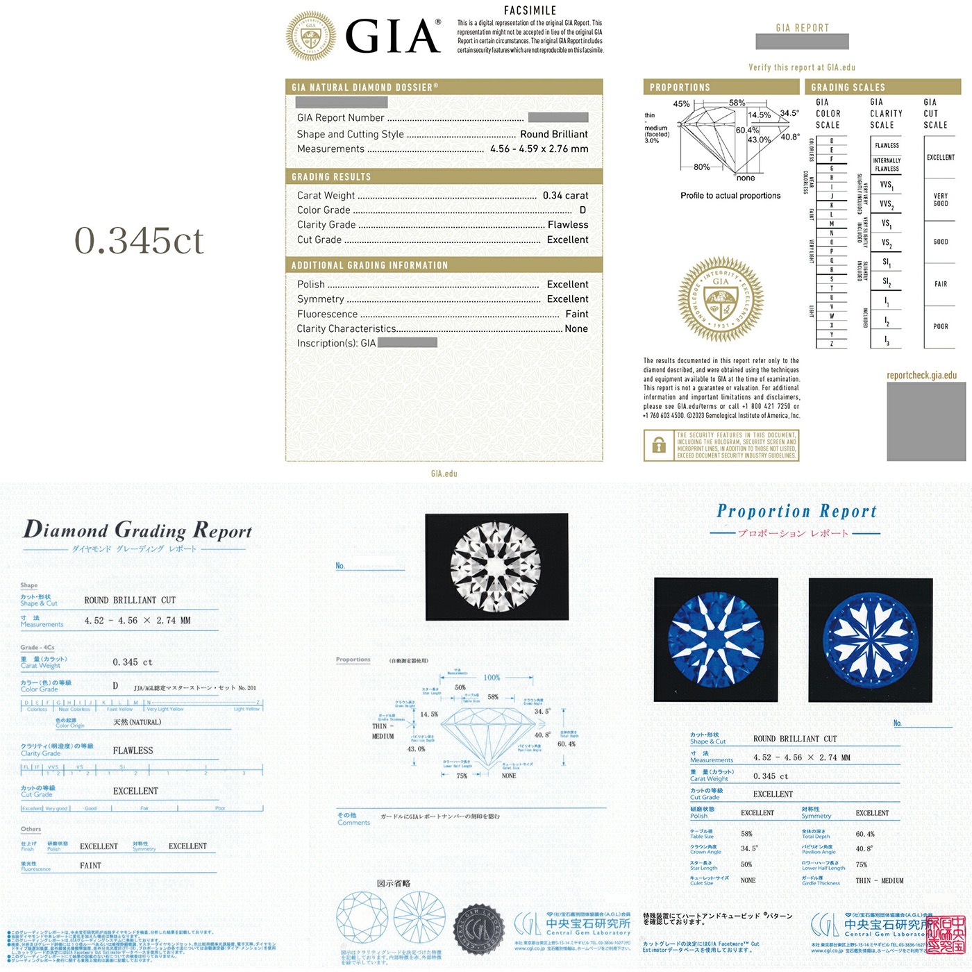 0.345カラット 寸法4.52mm-4.46mm×2.74mm(蛍光性FAINT)中央宝石研究所・GIA鑑定書付き