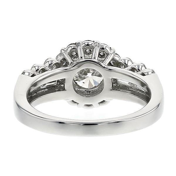 大粒石の周りに少し大粒なメレダイヤを隙間なく取り巻いて、さらに腕の部分は幅広デザインで少し大粒なメレダイヤモンド・ステップカットのダイヤモンドをセッティングいたしました。