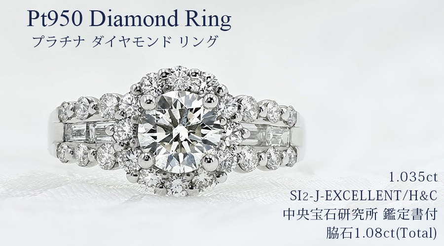 ダイヤモンド リング 1.035ct J SI2 EX H&C 脇石1.08ct(total) プラチナ 中央宝石研究所 鑑定書付 【R】