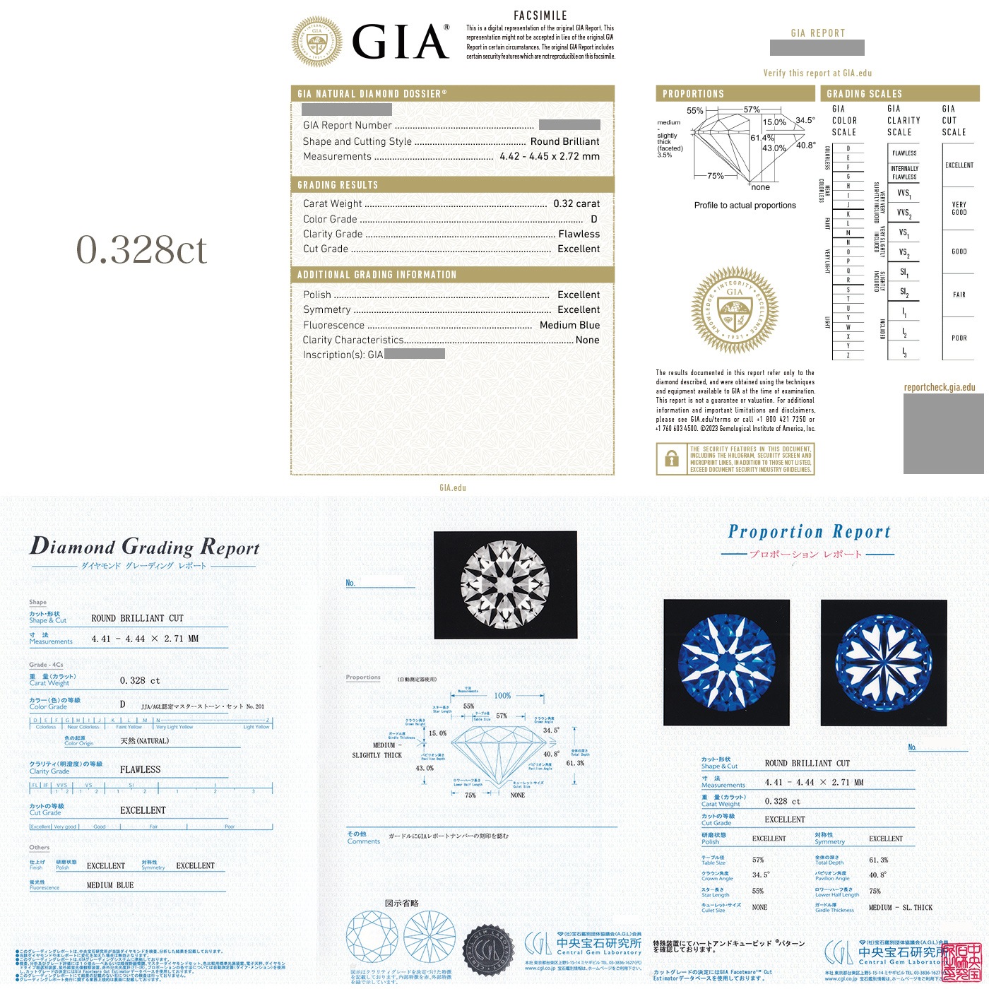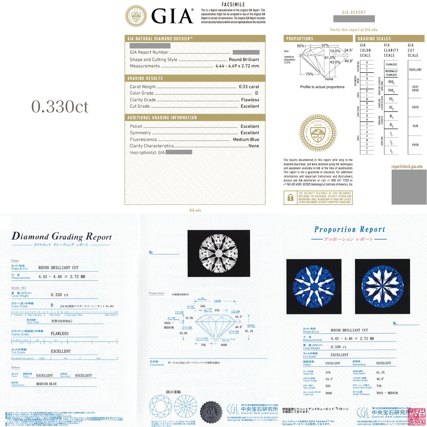 3EXCELLENTとは、カットグレード(総合評価)・ポリッシュ(研磨状態)・シンメトリー(対称性)全てにおきましてEXCELLENTの称号をもった非常に正確で希少性の高いダイヤモンドと申し上げられます。(※鑑定書には 3 EXCELLENTの 3 の数字での記載は有りませんのでご了承下さい。)