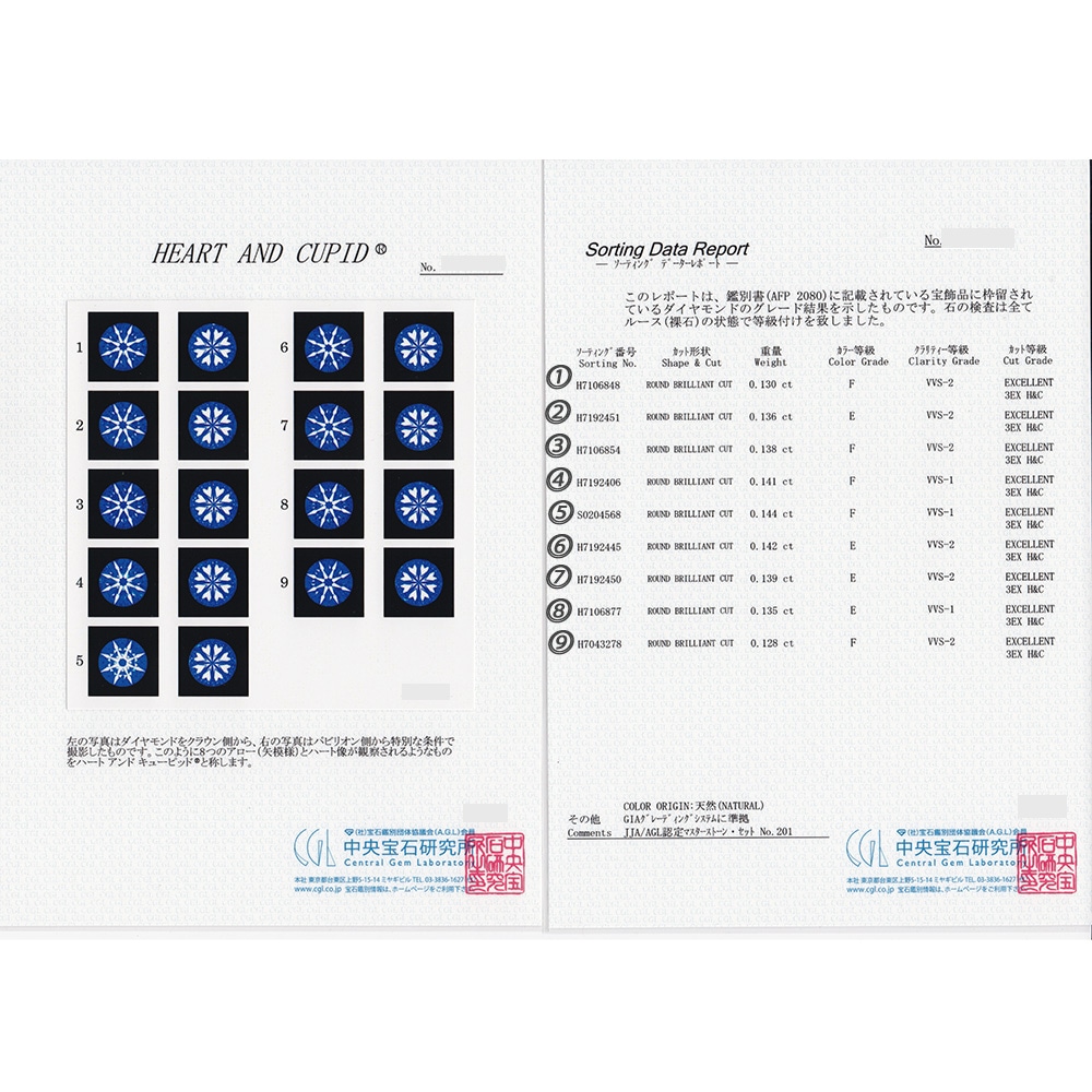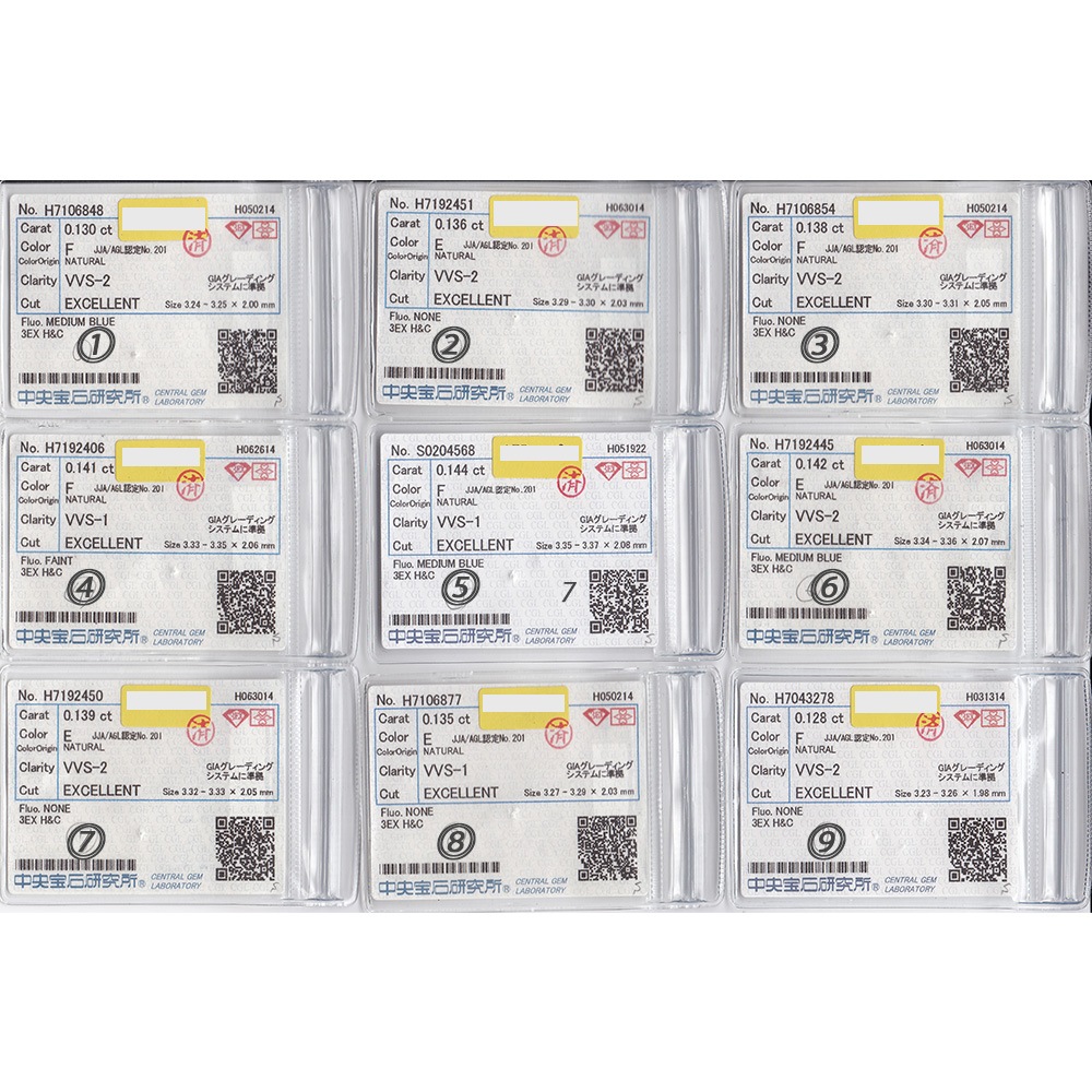 【使用宝石】 ダイヤモンド 1.233ct(Total) / 9石 【グレード】 クラリティ : VVS1~VVS2 10倍の拡大鏡で内包物の発見が非常に困難です カラー : E~F 無色透明です カット :3EXCELLENT/H&C 最高・究極の輝きです 【鑑定機関】 中央宝石研究所 データレポート付き鑑別書付 |