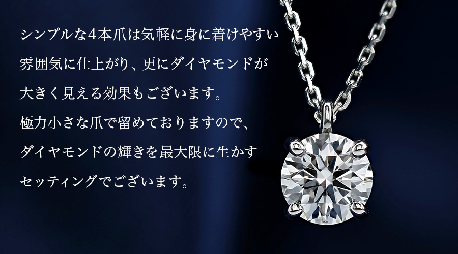 当店の一粒ダイヤモンドネックレスは極力小さな爪で留めておりますので、ダイヤモンドの輝きを最大限に生かすセッティングになります。