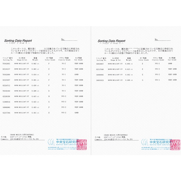 ダイヤモンドの等級分けにおきましては安心してお買い求めいただけます取り組みといたしまして、中央宝石研究所によるデーターレポート付き鑑別書付のダイヤモンドを使用しています。