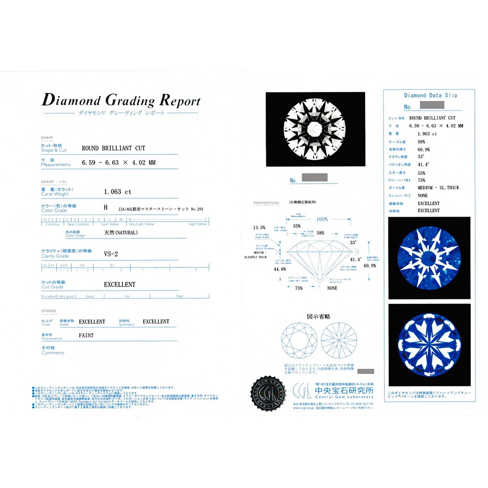 【使用宝石】 ダイヤモンド / 1.063ct 【グレード】 クラリティ : VS2 10倍の拡大鏡で内包物の確認が困難です カラー : H 無色透明です カット : 3EXCELLENT/H&C 究極の美しい輝きでH&C模様との両立 【鑑定機関】 中央宝石研究所 鑑定書付 |