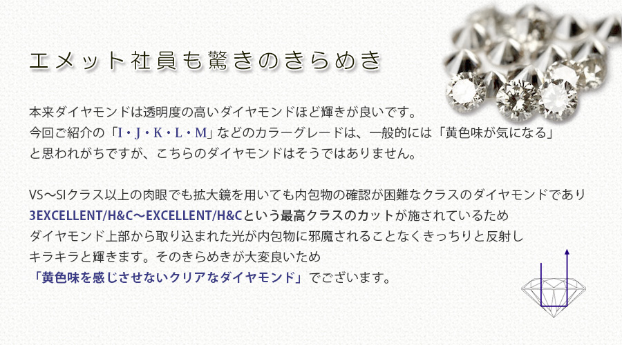 | カット | 3EXCELLENT/H&C 究極の美しい輝きでH&C模様との両立 |