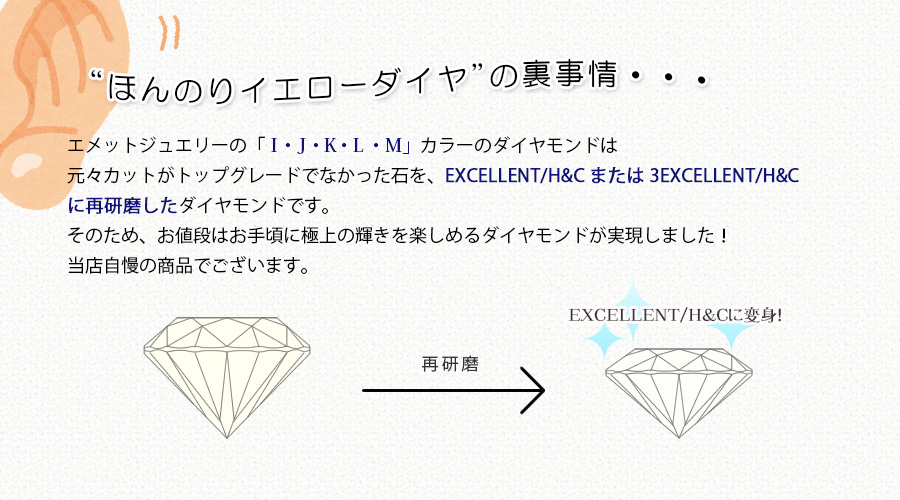 お客様の中でカラー等級分けの Lカラーは「黄色い?」と思われている事でしょう。ですが、全く黄色味を感じさせないダイヤモンドなのです。 それは、カットプロポーションに関係してきます。最高等級カットである3EXCELLENT/H&Cなので輝きが大変良いために黄色味を感じさせないのです。 無色透明のFカラーとJカラーのダイヤモンドを白い台に置いて撮影した画像でどちらが黄色いかわからないと思われます。(両方ともカットは3EXCELLENT/H&Cのダイヤモンドルースを使用しています) 価格にも反映され無色透明なダイヤモンドよりお得感があるダイヤモンドと申し上げられます。 自信をもっておすすめできます美しいダイヤモンドです。